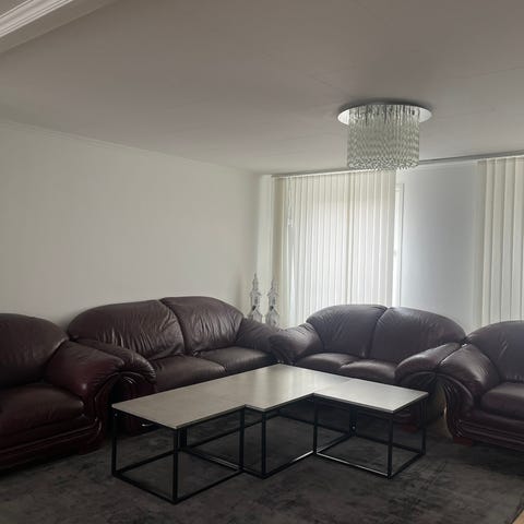 Soffgrupp 3-sits soffa och fåtölj brun klädd med trädetaljer