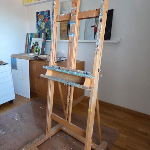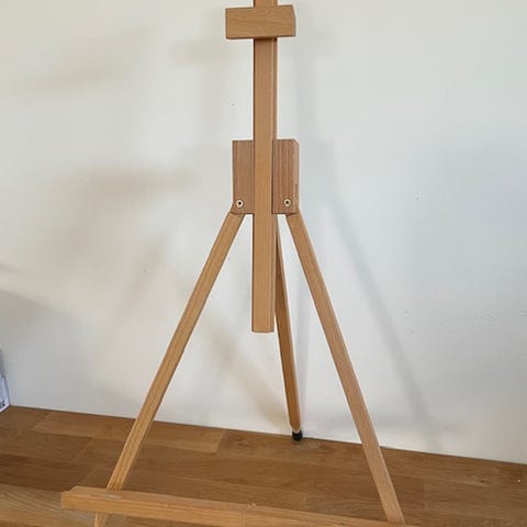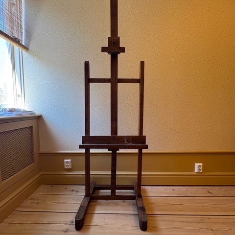 Starkt och stabilt, i oljat bokträ. Justerbar höjd och vinkel. Klarar en vikt på upp till 25 kg. Staffliets vikt: 13 kg. Bredd: 56 cm. Höjd: 163/352 cm. Max dukhöjd: 215 cm.