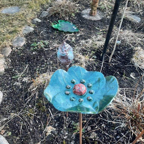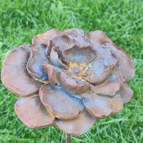 Finns olika klot i rost med ett armeringsjärn under stick ner i jorden.