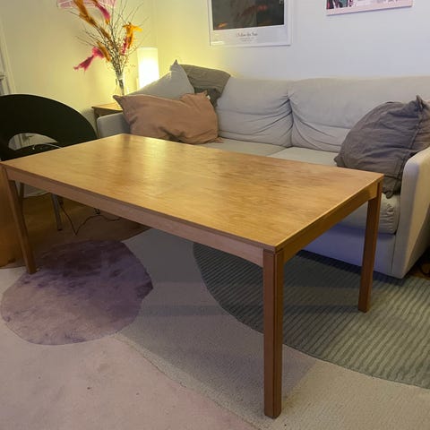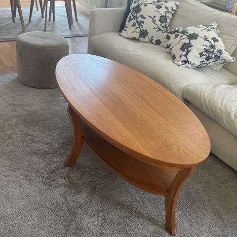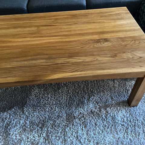 Säljer vårt gamla soffbord så vi köpt ett nytt. Fint skick, massivt trä, nyslipat och nyoljat. Vattenring på ena hörnet som är svagt synlig.