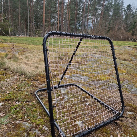 Rebounder fotbollsmål med svart nät och metallram. Målet används för träning av passningar, skott och mottagningar där bollen studsar tillbaka från nätet. Passar för fotbollsträning på plan, i trädgård eller annan öppen yta. Storleken framgår av bilderna och konstruktionen är avsedd för att stå fritt på marken.