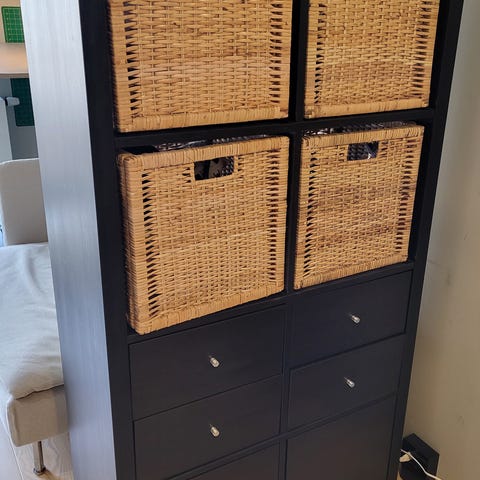 IKEA KALLAX Hylla med 4 insatser, svartbrun 147x147cm.