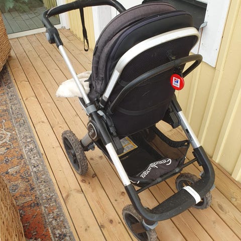 Sittdelen i grått tyg med fyra hjul och justerbart handtag. Sittdelen har sufflett. Under vagnen finns varukorg.