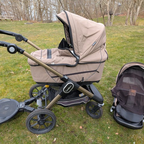 Liggdelen i brungrönt tyg med tillhörande skydd. Regnskydd finns.