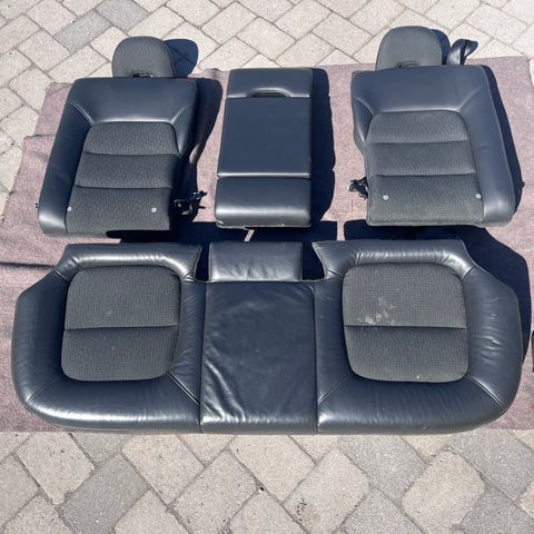 Svarta bilstolar i skinn med integrerade nackstöd, armstöd och bälten. Stolarna är fristående, Utrustade med fästen nedtill för infästning i bilens golv. Passar som ersättningsstolar eller om man vill komplettera befintlig inredning med liknande säten. Skickas ej, hämtas på plats.