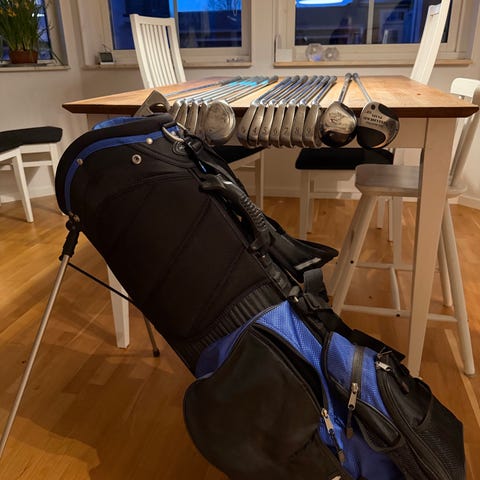 Ozone Quest golfset med bag och vagn. Setet innehåller flera järnklubbor samt metalwoods, enligt bilder. Klubborna levereras i en stående golfbag monterad på en golfvagn med två hjul. Passar för golfspelare som vill ha ett komplett set med bag och vagn för spel på bana och träning på range.