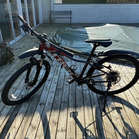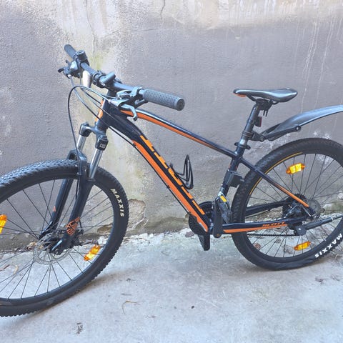 Fin och mycket välvårdad 24-växlad mountainbike för ungdom (43 cm ram, passar 160-175 cm längd) komplett med godkänt lås, cykelstöd, skärm, reflex och belysning fram och bak. Har förvarats i varmgarage.