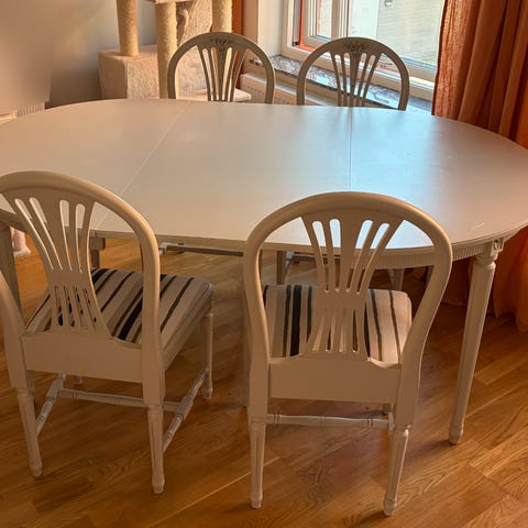 Runt bord med iläggsskiva, något slitet, samt åtta stolar