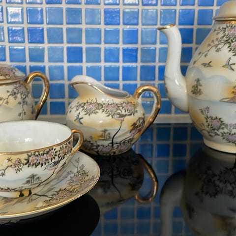 &Tradition porslinservis te- och kaffeservis i vit grundfärg med dekorativt mönster med fåglar och naturmotiv. Servisen består av tekanna, serveringskanna och flera koppar med tillhörande fat samt assietter. Passar för servering av te, kaffe och andra varma drycker vid måltider och fikastunder. Sockerskål, mjölkkanna, 12 koppar, fat o assietter.