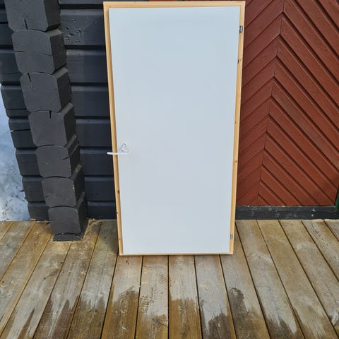 Nygjord dörr med karm, passar till t.ex lekstuga. En snickare har gjort dörren, aldrig använd. Karmen yttermått 154,4 × 69 cm. Djup 9.2 cm. Dörrbladet är 147,7 x 62 cm. Träram, dörrbladet är klädd med masonit