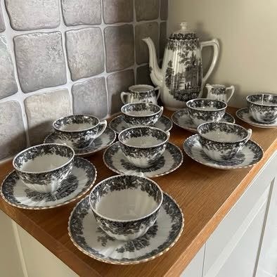 Säljer en fin porslinsservis i klassiskt engelskt mönster med vinblad i gröna toner.