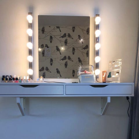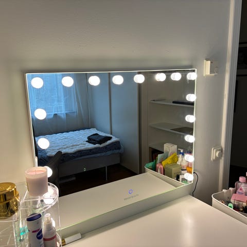 IKEA sminkbord med väggmonterad bordsskiva i vit färg och två utdragslådor. Ovanför bordet finns en rektangulär spegel med inbyggd ram och flera lampor runt kanterna som ger jämn belysning vid sminkning eller styling. Bordet är fäst i väggen med konsoler vilket frigör golvyta och ger plats för stol eller pall under. Passar i sovrum, walk-in-closet eller andra utrymmen där en smink- eller arbetsplats behövs.