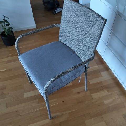 Fåtölj i rotting med grå sitt- och ryggdyna. Stommen är flätad rotting i naturfärg och dynorna har avtagbara tygöverdrag i ljusgrått. Passar för användning utomhus , inköpt som del av utemöbel set från chili