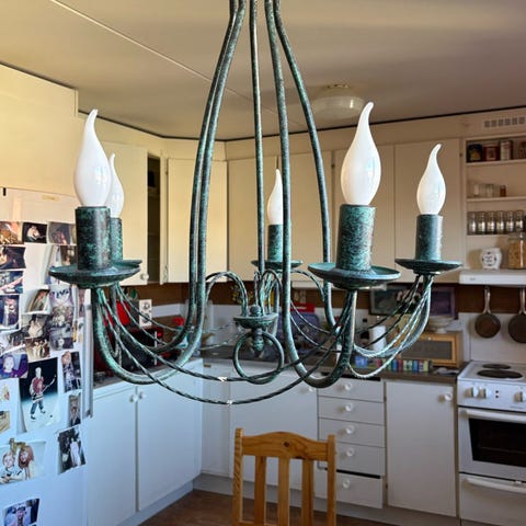 I vitlaserat trä. Hänger i kedja som är lite rostbrun, den matchar koppen vid takfästet. På kedjan hänger nu en extra bit kedja, 30 cm, som man kan haka i om man vill förlänga lampan, dock måste man förlänga elkabeln om detta ska göras. Elkontakt måste monteras, lika som det ofta är när man köper taklampa t ex på Ikea.