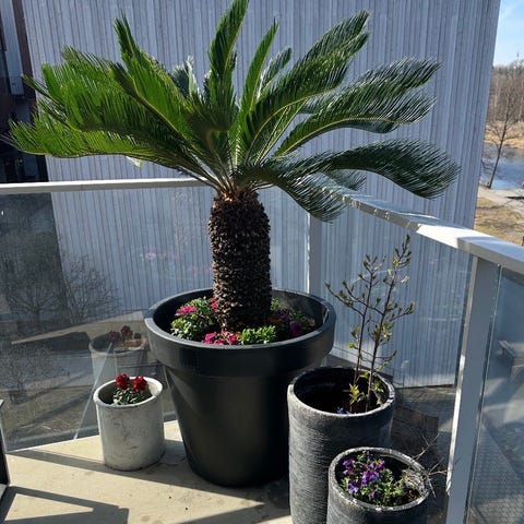 Första palmen 240 cm (med kruka till toppen av bladet), andra palmen 230 cm. Kruka höjd 45 cm och 65 cm diameter.