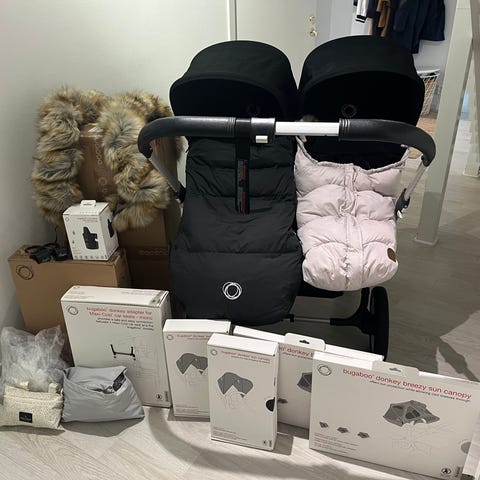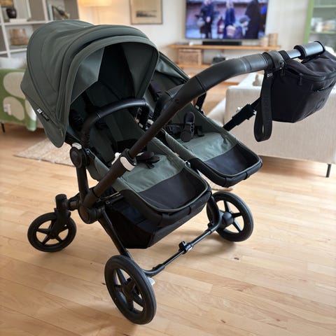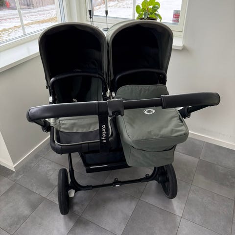 Bugaboo syskonvagn med liggdel och sittdel i svart färg. Vagnen har svängbara framhjul och större bakhjul samt justerbart handtag. Sittdelen har sele och avtagbar bygel. Under vagnen finns en varukorg för förvaring. Passar för transport av två barn samtidigt, ett liggande och ett sittande.