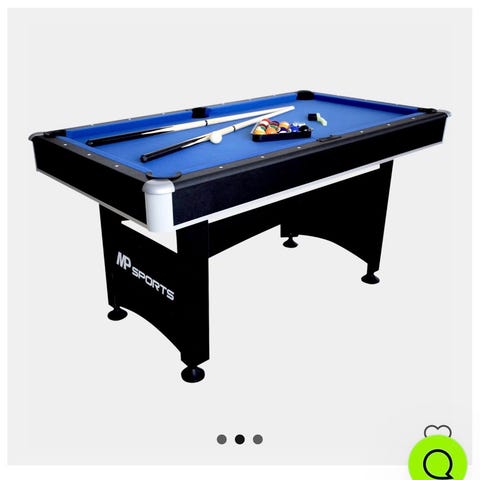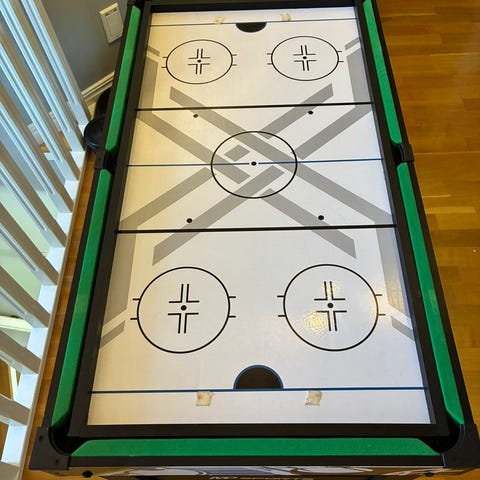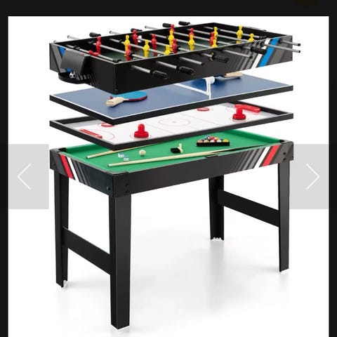 Spelbord multifunktionellt bordspel i trä med blå spelyta. Bordet är utformat för flera olika spel, bland annat biljard, bordtennis, airhockey och fotbollsspel, där spelplanerna kan bytas genom att överdelen vänds eller byts ut. Konstruktionen består av en stabil träram med ben och en överdel i MDF med PVC-laminat. Bordet är avsett för inomhusbruk och passar för familjespel eller fritidsrum.