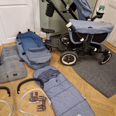 Bugaboo Donkey från 2017, lite sliten såklart men fullt fungerande och har mycket kvar att ge. Medföljer två st sittdelar och en liggdel, samt en blå och en rosa dyna från Bugaboo och ett regnskydd. Allt nytvättat och redo att användas.