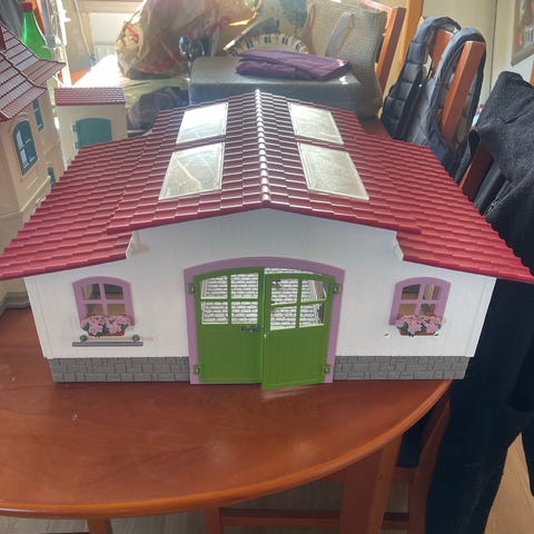 Dockhus stall i trä med öppningsbart tak och flera spiltautrymmen. Utsida i mörk färg med vita fönstergaller och tak i tegelröd färg. Till stallet följer två hästfigurer i plast. Passar som leksak eller som del i en större stall- eller bondgårdsmiljö för dockor och djurfigurer.
