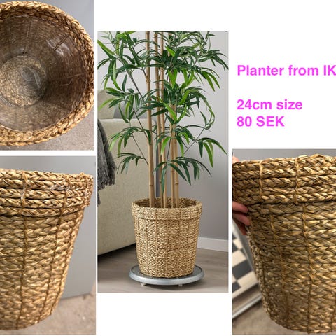 Stor rund kruka med ytterdel i flätad rotting och innerkruka i plast. Färgen är grå/natur. Krukan har dräneringshål i botten på innerkrukan och lämpar sig för plantering utomhus i trädgård, på altan eller balkong. Modellen är rymlig och anpassad för större växter eller mindre träd och har måtten övre diameter 70 cm botten 43 cm och höjden är 60 cm. Nypris var 2.985 kr