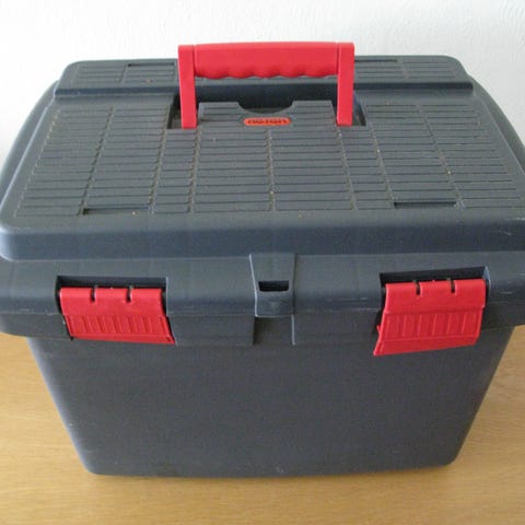Verktygslådor i svart plast och metall. En plastlåda med lock, bärhandtag och flera mindre fack i locket för sortering av skruv och smådelar. 39x20X16