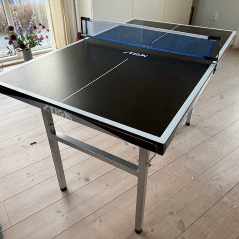 Stiga bordtennisbord i hopfällbar modell. Bordsskiva i blå färg med vit kantlist och mittlinje. Utrustat med nät som monteras längs mitten av bordet. Benställningen är vikbar, vilket gör bordet enkelt att fälla ihop och förvara platt mot vägg eller golv. Passar för inomhusbruk i exempelvis vardagsrum, hobbyrum eller liknande utrymmen där man vill spela bordtennis på begränsad yta.