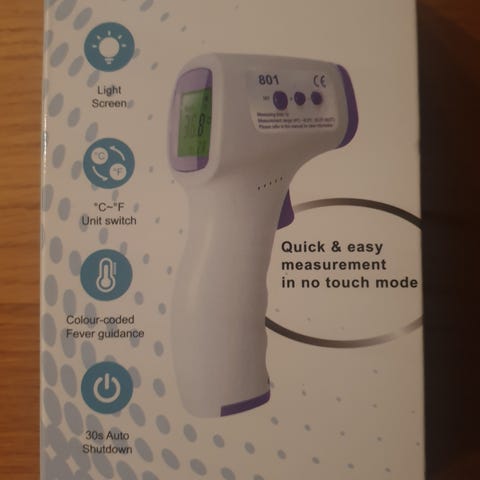 XINJIA medicinsk infraröd panntermometer för kontaktfri mätning av kroppstemperatur. Termometern avläser temperaturen via pannan med digital display. Levereras i originalförpackning med bruksanvisning och certifikat enligt märkning på kartongen (bland annat CE, FCC och RoHS). Lämplig för mätning av kroppstemperatur hos både vuxna och barn utan direkt hudkontakt.