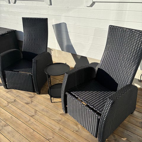 Det finns några mindre hål i konstrotingen se bilder. Solsängarna fungerar bra och dynorna till är som nya.
