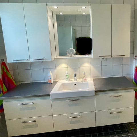 Badrumspaket med tvättställsskåp, spegelskåp, handdukstork och badrumsfläkt