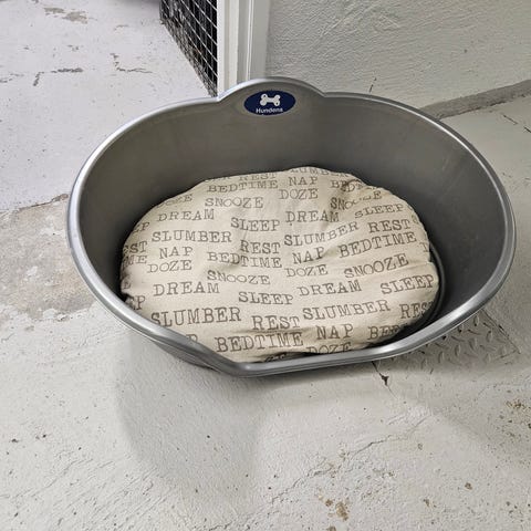 Praktisk hundkorg som man bara kan lägga i en fäll som kan tvättas. Måtten på korgen är: 65 cm bred och 40 cm djup.