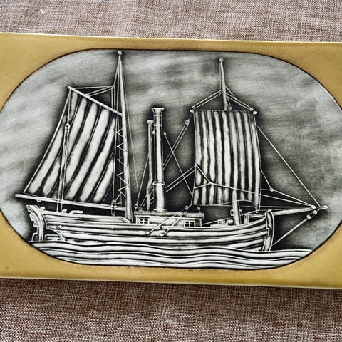 Set om 3 delar i tenn. Skål EIK Norge med texten Må lyckan följa dig, höjd 10 cm diameter 10 cm. Vikingaskepp Tinn Per Bjønnes (TPB) handstöpt i hög kvalitet, höjd 7 cm längd 12,5 cm, används som saltkar eller prydnad. Liten häst i massivt tenn höjd 4,5 mc.