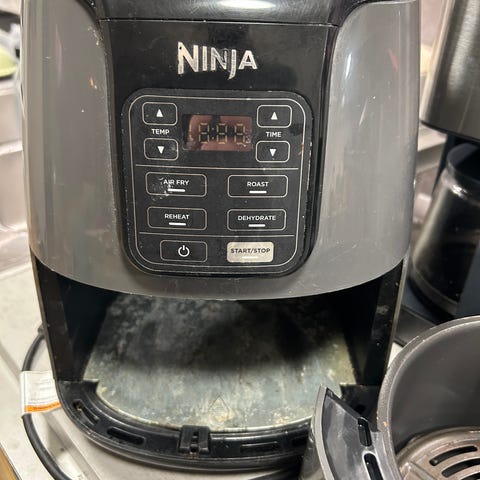 Ninja Double Stack XL airfryer, med dubbla lådor, totalt 9,5 liters kapacitet. Modell SL400EUCP. Endast använd ett fåtal gånger (max fem). Säljes med passande bakpappersinlägg och silikonformar.