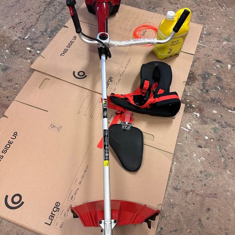 Bensindriven grästrimmer/röjsåg i röd färg. Modellen har tvåhandsgrepp och levereras med sele för avlastning vid arbete. Utrustningen inkluderar trimmerhuvud med tråd, treuddig röjklinga samt cirkelklinga för grövre vegetation. Passar för trimning av gräs, sly och lättare röjningsarbete i trädgård och runt tomtgränser.