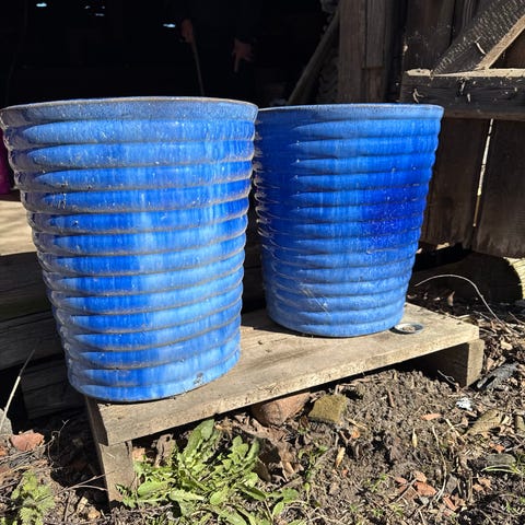 Två större krukor i terrakotta med tillhörande fat. Synbart använts med patina och slitningar.
