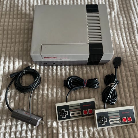 Nintendo NES 8-bit spelkonsol med handkontroller, ljuspistoler och spel
