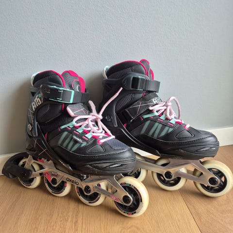 Rullskridskor av storlek 35-38. Snören för knytning med support av kardborrband samt snäppfäste för stabilitet.