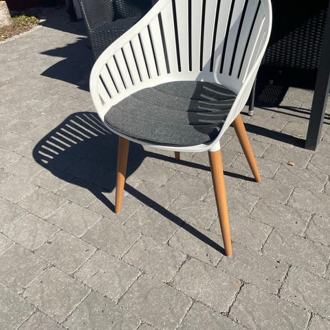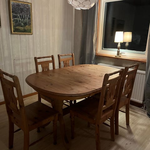 Matsalsgrupp bestående av ett bord och sex stolar i massivt hållbart trä. Bordet är runt med två iläggskivor så längden kan varieras. Utan skivor är bordet 120 cm långt, varje skiva 50 cm, så med båda 220 cm långt. Bredd 120 cm höjd 75 cm. Stolarna är klädda och sitthöjd 45 cm sittbredd 45 cm sittdjup 40 cm. Har använts som vardagsrumsbord. Hämtas i Umeå.