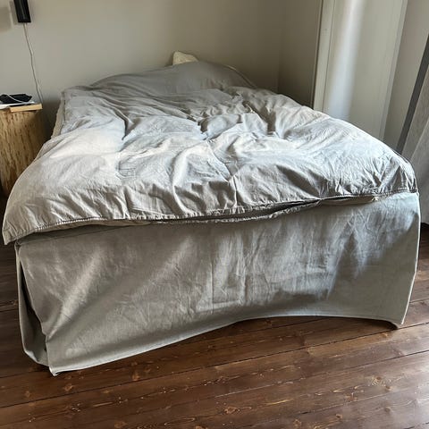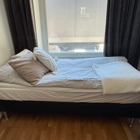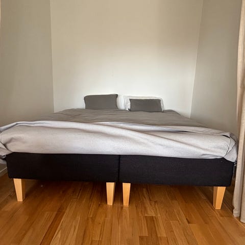 IKEA säng med resårbotten. Sängen står på ben i trä och beige sängkappa runt underdelen.