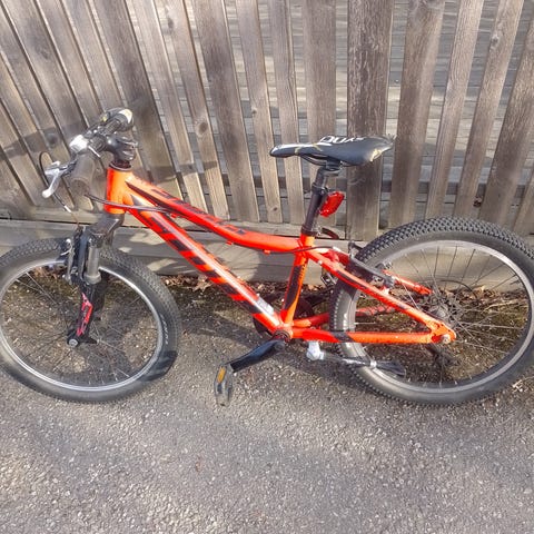 Fin barncykel från Peak Lampona förvarad i garage, men visst slitage förekommer: