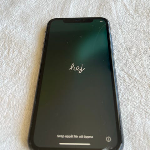 Observera att skärmen har synliga sprickor, särskilt i ett hörn, enligt bilderna. Övriga detaljer om skick, batterihälsa och medföljande tillbehör framgår inte av uppgifterna och kan behöva kontrolleras separat.