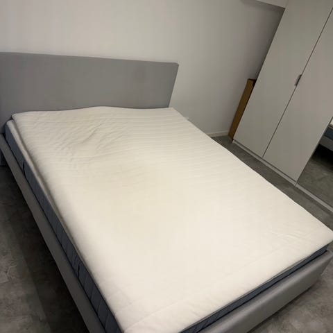 Sparsamt använd Ramnefjäll-säng från IKEA med Vesteröy pcktrmadr 160x200 och bäddmadrass från Jysk (wellpur bokselvi, medium/fast)