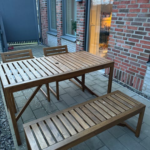 Matbord med 4 stolar inkl dynor. Matbordet är slipat och inoljat. Stolarna skulle behöva lite kärlek efter en vinter utomhus. Inköpta på Ikea förra året. Nämmarö heter serien.