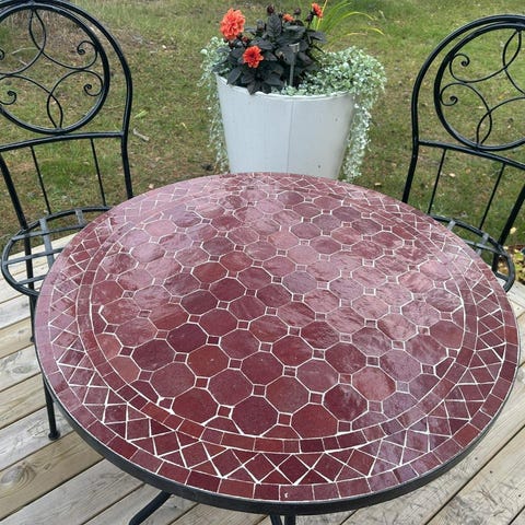 Diameter 70 cm, höjd 73 cm. Bordställningen är vikbar.