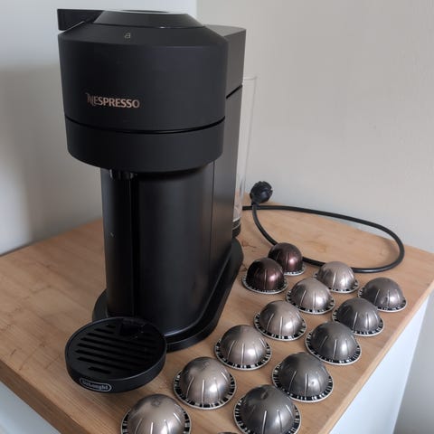Uppsamlingsbehållare för använda kapslar och droppbricka i metall.