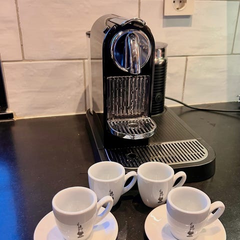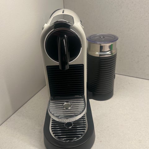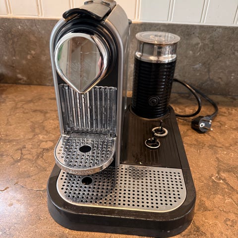 Nespresso espressomaskin i svart med tillhörande kapselbehållare och mjölkskummare/värmare (två olika vispar). Maskinen kräver kapslar.