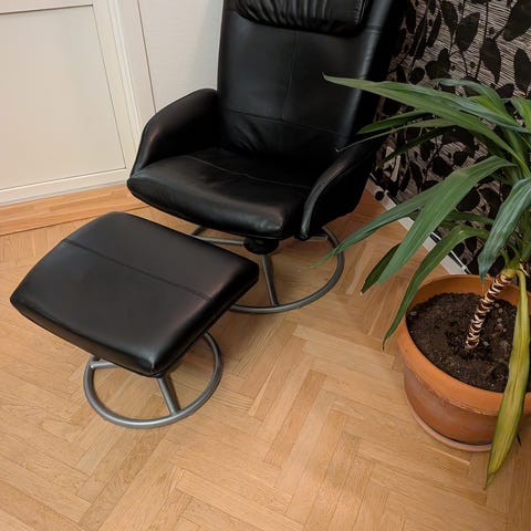 Fåtölj och fotpall är i bra skick, men det finns en liten skada som knappt syns, se sista bilden.