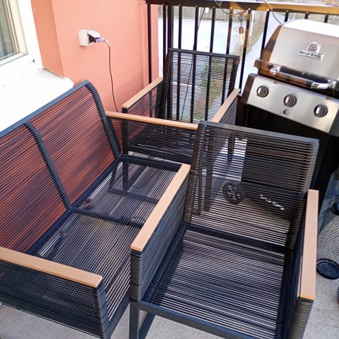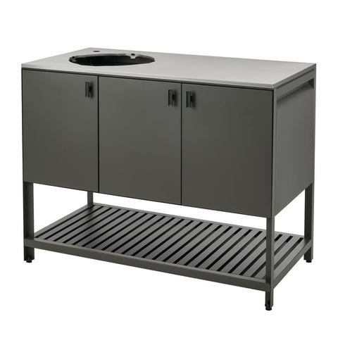Utekök Verona i hörnmodell med svart stomme i metall och bänkskivor i trä från Plantagen. Köket har inbyggd fyrkantig diskho i rostfritt stål med avlopp/avloppsslang monterad under. Över bänken finns ribbade ryggpaneler som fungerar som avskärmning eller stänkskydd. Under bänkskivorna finns öppna hyllplan i metall för förvaring. Passar för placering på altan eller uteplats som arbets- och avställningsyta vid matlagning utomhus.