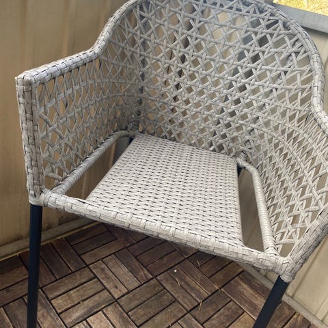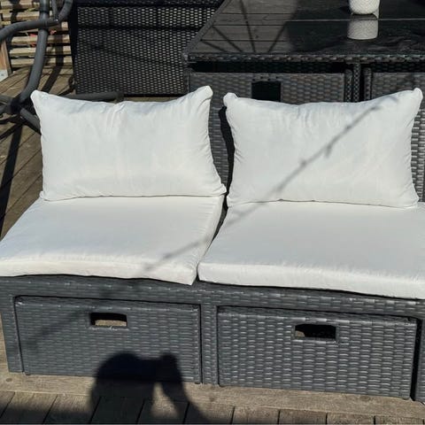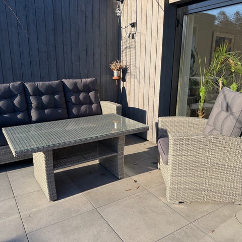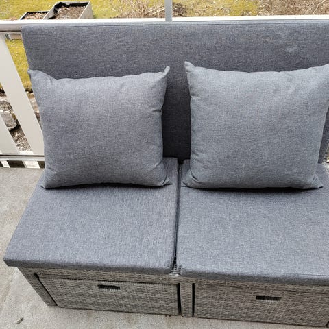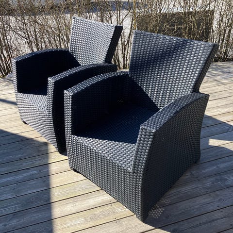 Loungefåtölj i konstrotting med mörkgrå sitt- och ryggdynor. Möbeln består av två sittdelar som kan placeras intill varandra för att skapa en bredare sitt- eller viloyta. Under sitsarna finns utdragbara förvaringslådor som kan användas för exempelvis dynförvaring eller mindre tillbehör. Passar för användning på balkong, altan eller uteplats.