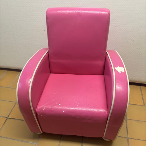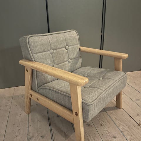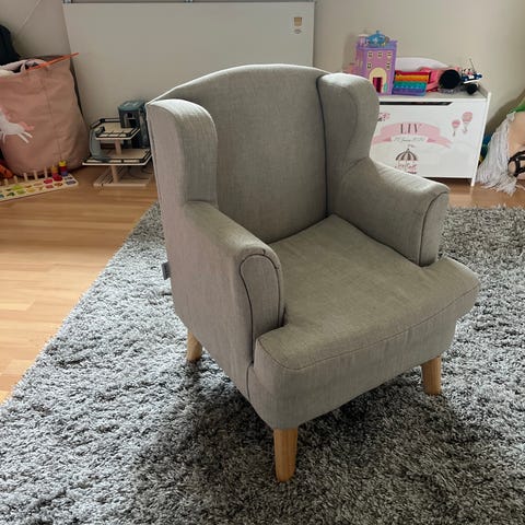 IKEA barnfåtölj i grått tyg. Fåtöljen har hög rygg med vingliknande sidor och tre dekorativa knappar i ryggen. Rak sits och armstöd i samma tyg. Ben i mörkt trä. Passar som sittplats i barnrum eller lekhörna.