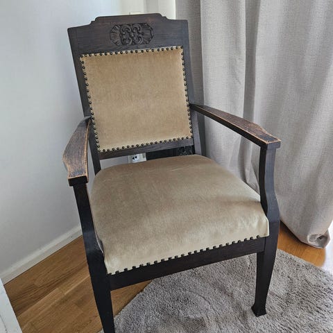 Säljer en stilfull karmstol med kremvit/beige träram och grönmönstrad stoppning. Stolen har en klassisk form med svängda kabrioleben, öppna armstöd och en elegant ryggkudde – passar fint i vardagsrum, sovrum eller som en accentstol.